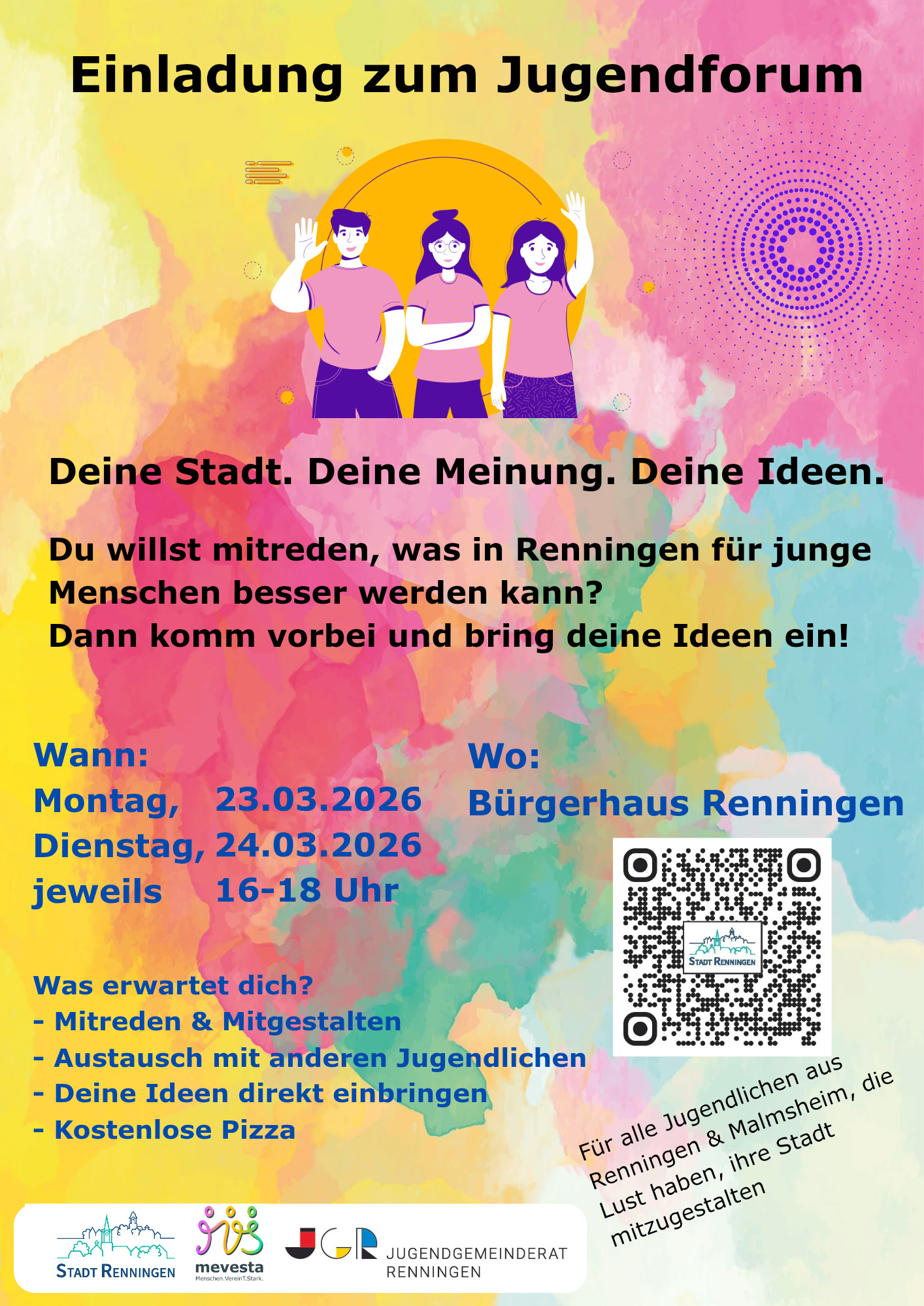 Du bist zwischen 10 und 18 Jahren jung und hast Ideen, Wünsche oder Kritik rund um das Leben in Renningen? Dann komm vorbei und mach mit beim Jugendforum Renningen!