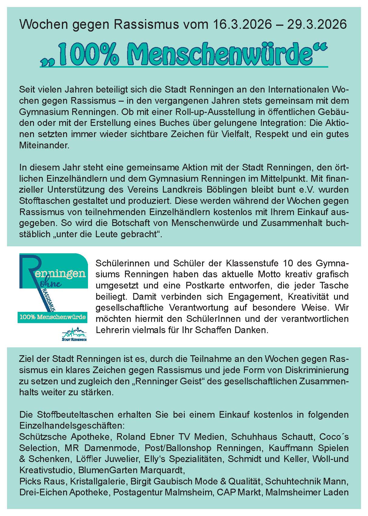 In diesem Jahr steht eine gemeinsame Aktion mit der Stadt Renningen, den örtlichen Einzelhändlern und dem Gymnasium Renningen im Mittelpunkt. Mit finanzieller Unterstützung des Vereins Landkreis Böblingen bleibt bunt e.V. wurden Stofftaschen gestaltet und produziert. Diese werden während der Wochen gegen Rassismus von teilnehmenden Einzelhändlern kostenlos mit Ihrem Einkauf ausgegeben. So wird die Botschaft von Menschenwürde und Zusammenhalt buchstäblich „unter die Leute gebracht“.