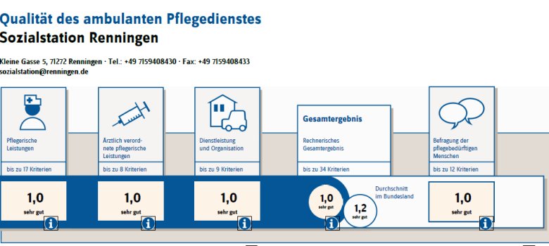 Die Sozialstation Renningen, als anerkannter Pflegedienst, ist an Rahmenverträge über ambulante pflegerische und medizinische Versorgung gebunden und Vertragspartner aller Krankenkassen und Pflegeversicherungen. Zur Sicherung der Qualität nehmen wir jährlich Termine mit dem Medizinischen Dienst der Krankenkasse wahr, um unsere Leistungen kontinuierlich zu optimieren. Unsere Berichte sind öffentlich und hier abrufbar.