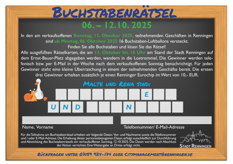 Wie zuletzt 2023 findet auch bei diesem Verkaufsoffenen Sonntag wieder das beliebte Buchstabenrätsel der Stadt Renningen statt. Ab Montag, den 6. Oktober 2025 können Sie sich auf die Suche nach Buchstaben-Luftballons in den am Verkaufsoffenen Sonntag teilnehmenden Geschäften machen. Insgesamt werden 16 Buchstaben-Luftballons versteckt. Finden Sie alle Buchstaben und lösen Sie das Buchstabenrätsel. Alle Lose, die am 12.10.2025 bis 18:00 Uhr am Stand der Stadt Renningen auf dem Ernst-Bauer-Platz abgegeben werden, wandern in die Lostrommel. Die 16 Gewinner werden telefonisch oder per E-Mail in der Woche nach dem Verkaufsoffenen Sonntag benachrichtigt. Für jeden Gewinner steht eine kleine Überraschung in einem der teilnehmenden Geschäfte bereit. Die ersten drei Gewinner erhalten zusätzlich je einen Renninger Eurochip im Wert von 10,- EUR. Die Rätselkarte liegt in den Geschäften aus und kann hier heruntergeladen werden.
